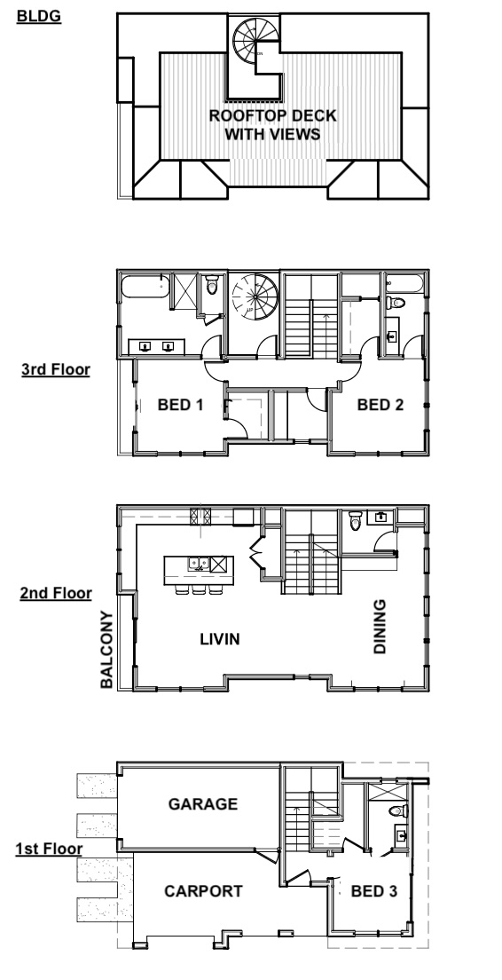 Key features include: Three-story layout, Private rooftop deck with 360-degree views, Dark exterior with clean lines, Warm interior accents, 2 covered parking spaces. The home has 3 bedrooms, 3 bathrooms, and a 0-car garage.